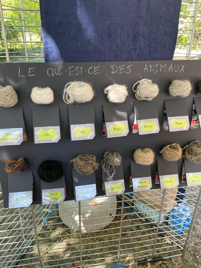 Les enfants et les adultes ont découvert les étapes de création de la laine en partant d’une toison brute vers la mise en pelote de la laine en passant par le nettoyage, le cardage et le filage sur fuseau ou rouet.